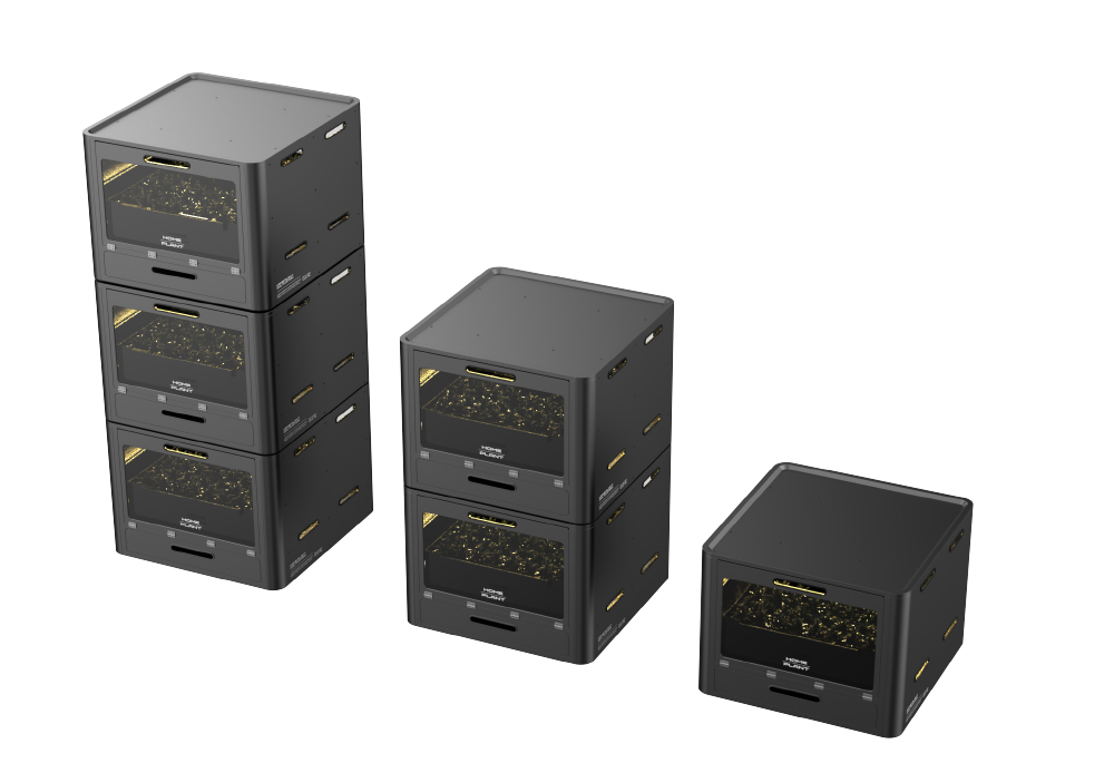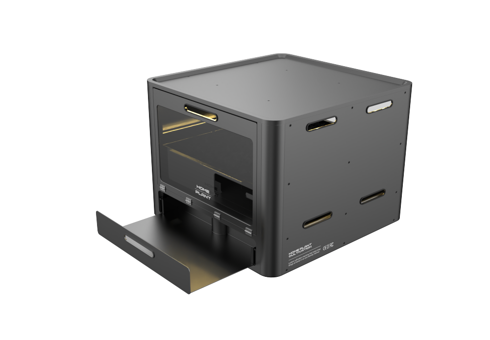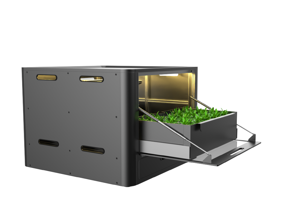 This is a modular plant cultivator with AI. You can grow plants to the size you want at home, and since it is modular, it can be used as a factory, so mass production is possible. It is designed with mass production in mind with a steel plate structure, and it cares for plants in real time to help them grow. It has a simple design with a black frame color.
