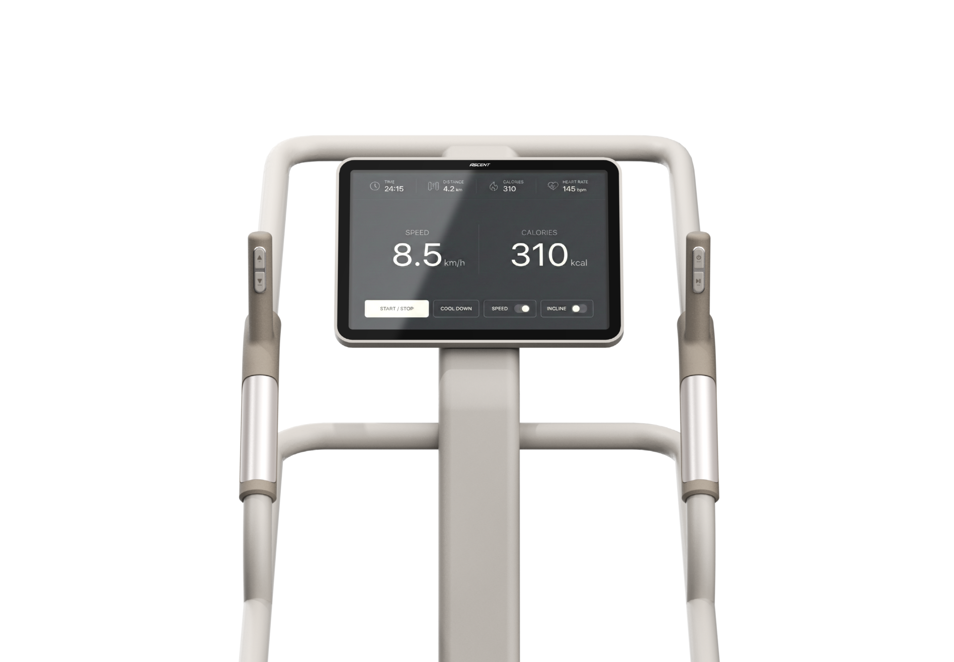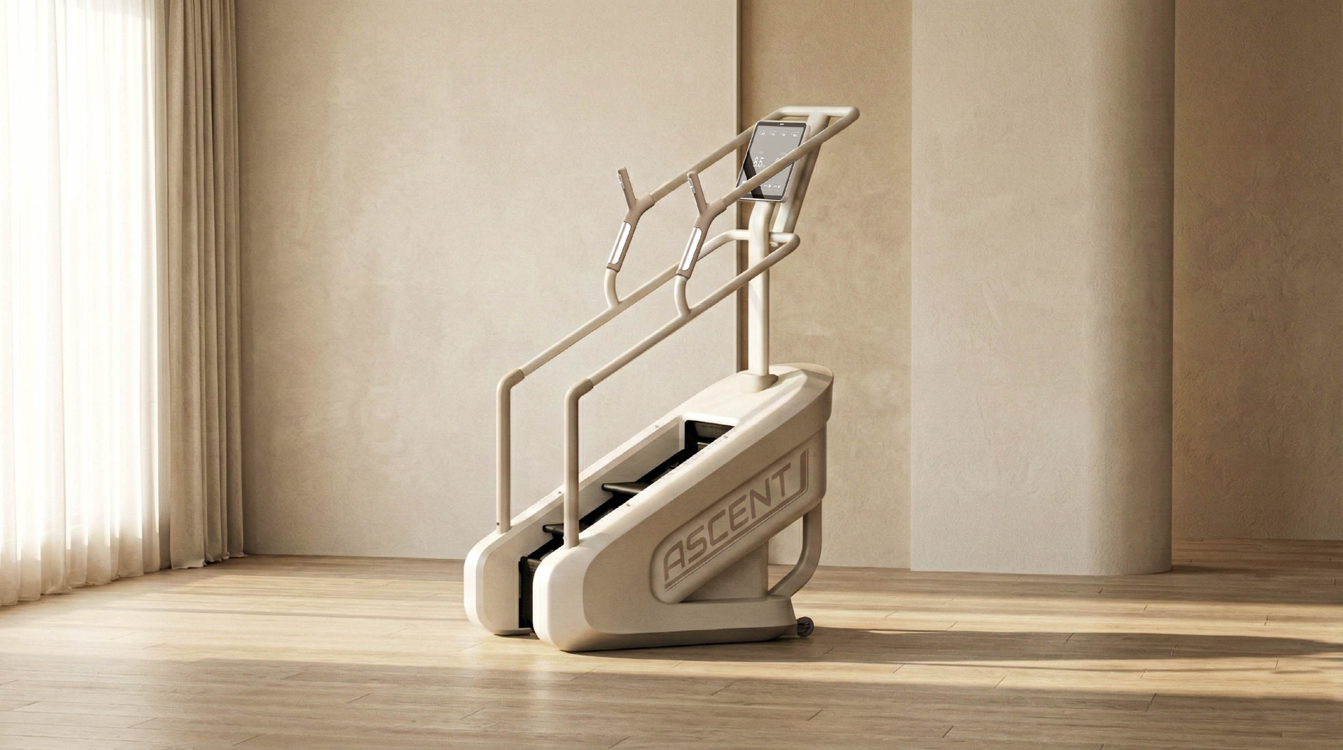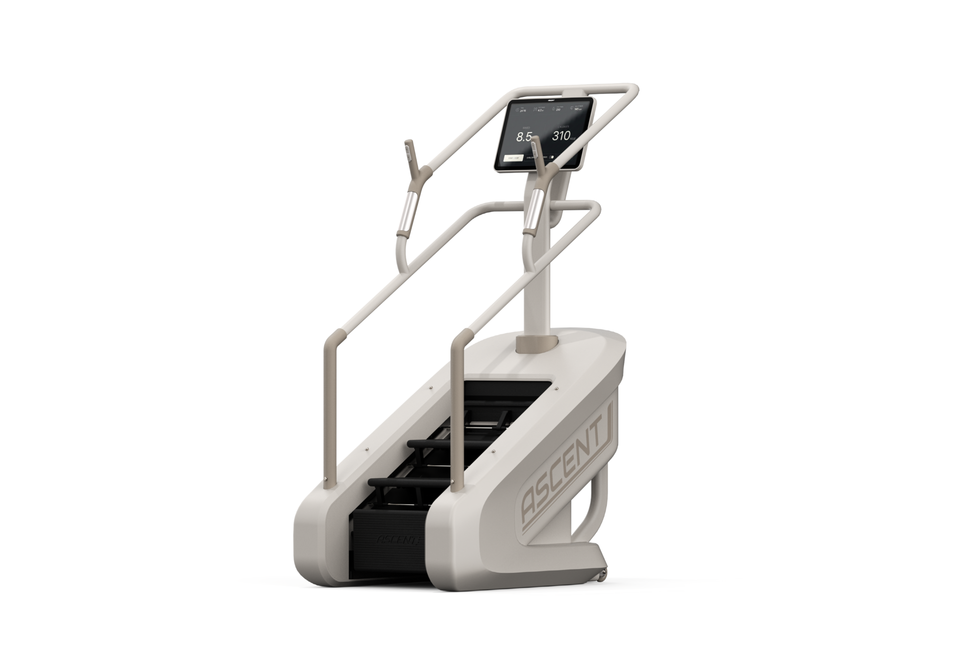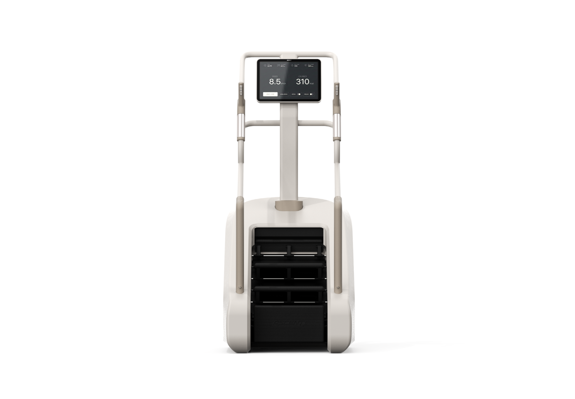 The minimalist beige palette and sleek silhouette blend seamlessly into any space, elevating your interior aesthetic with a touch of sophistication. Ergonomically designed handgrips provide a secure, natural feel, ensuring maximum stability and comfort throughout every step of your climb. Furthermore, the expansive wide-screen display offers an immersive experience, allowing you to stay fully focused on your performance and goals.