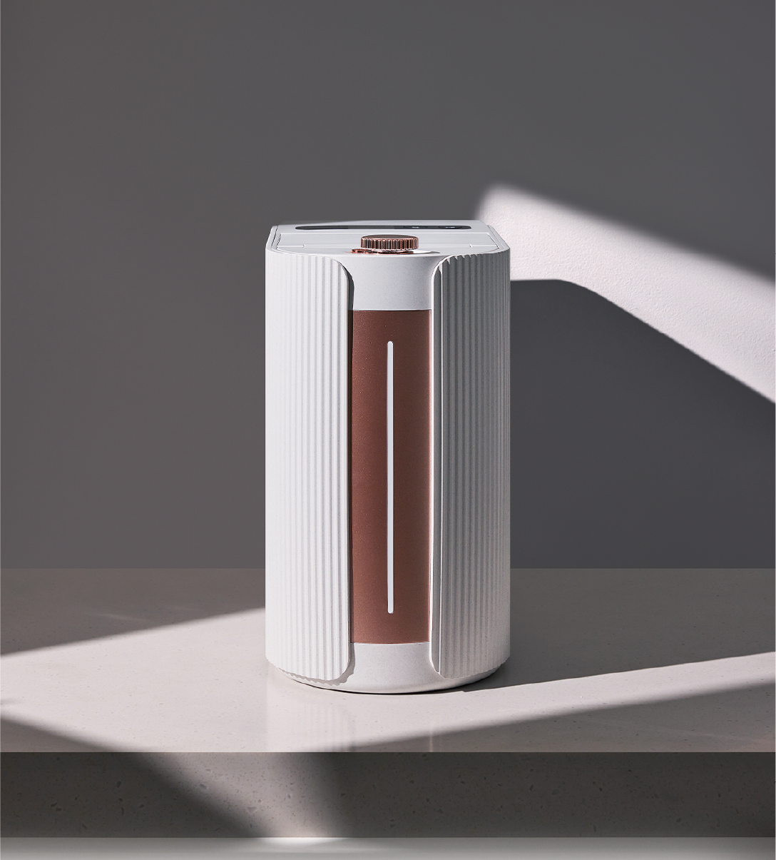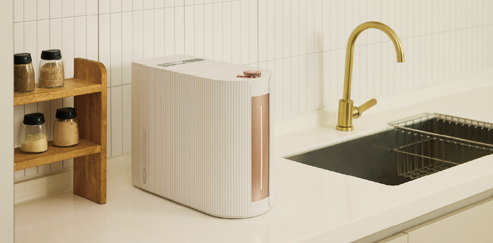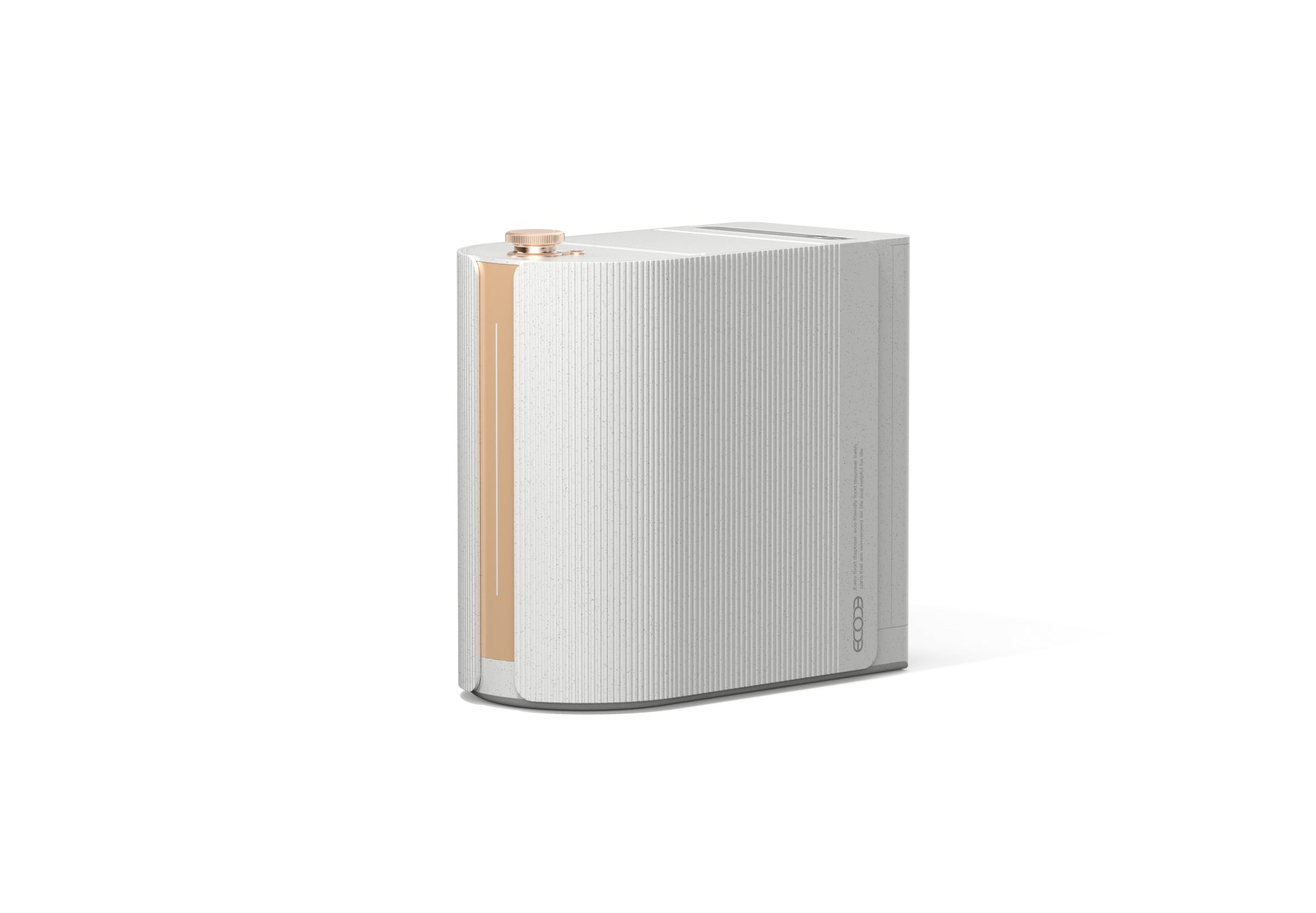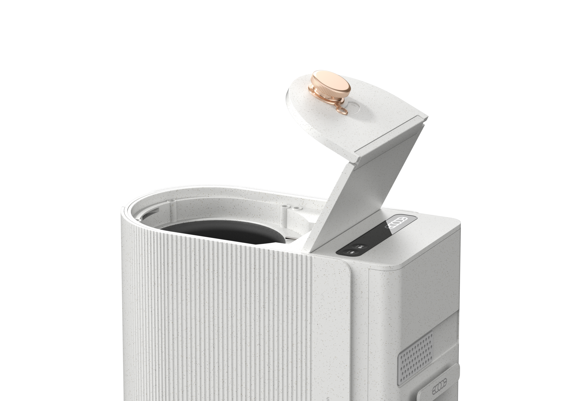 The Ecoche Mini features a sophisticated linear pattern that seamlessly integrates with modern interiors, redefining the food waste processor as a trendy home object. Its elegant Rose Gold accents deliver a sense of calm luxury, transforming a functional appliance into a high-end decorative element for the kitchen. By harmonizing minimalist structural lines with a premium color palette, the design achieves a perfect balance of aesthetic purity and contemporary style.