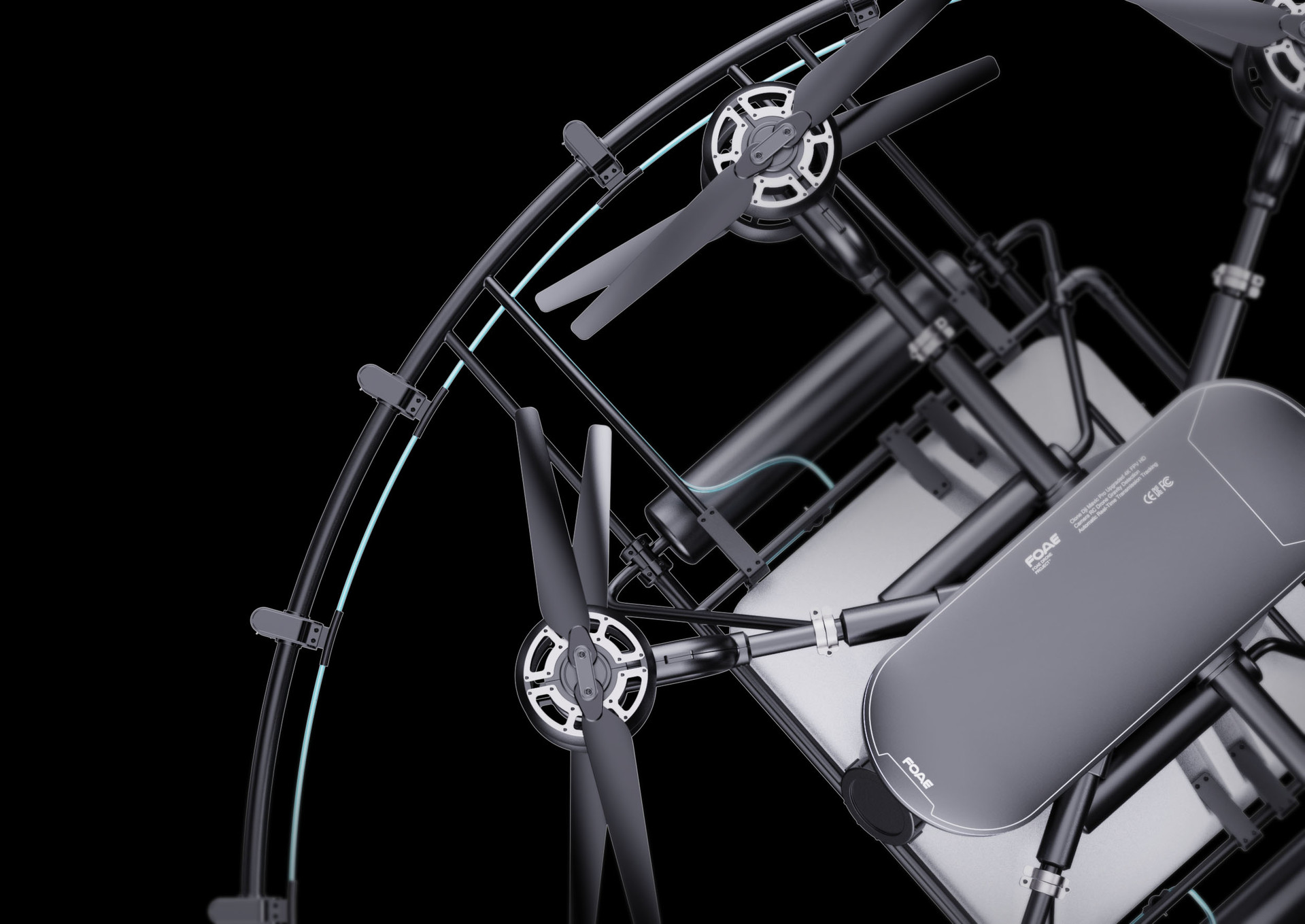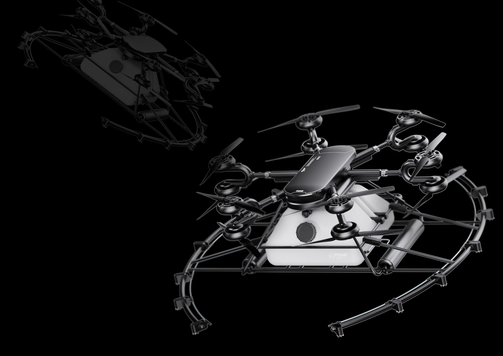 The overall body line layout was developed with a strong focus on the functional requirements of an agricultural drone. Reflecting the characteristics of industrial operating environments, a black corrosion-resistant color scheme was applied to enhance durability and robustness. Design highlight elements include a front-mounted LED ON/OFF operation sensor and integrated detection modules, which not only improve usability and visibility but also reinforce the drone’s advanced technological image.