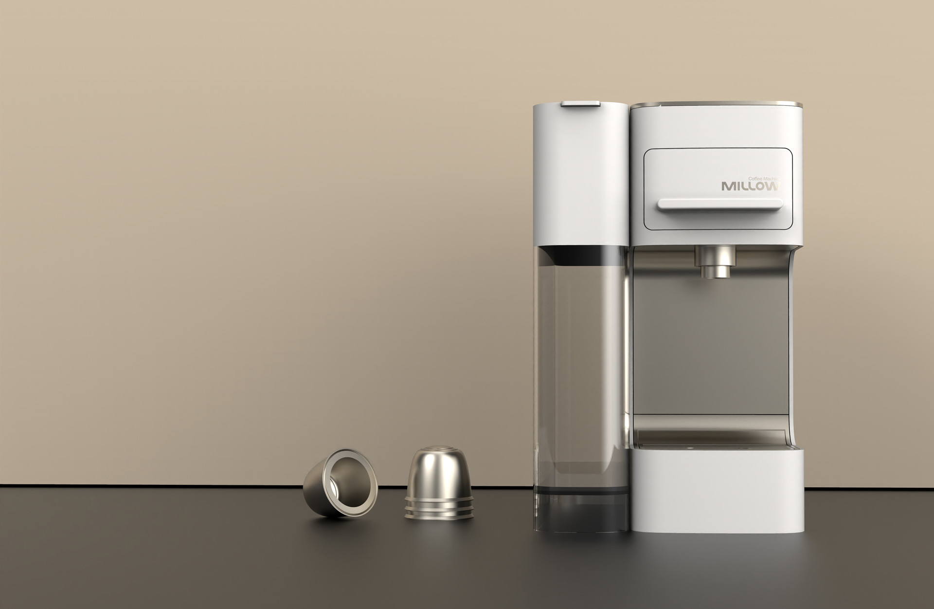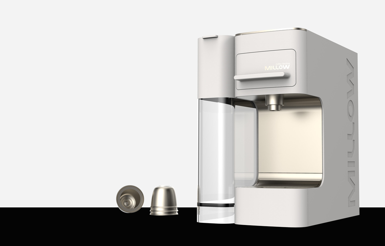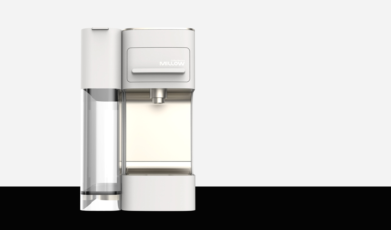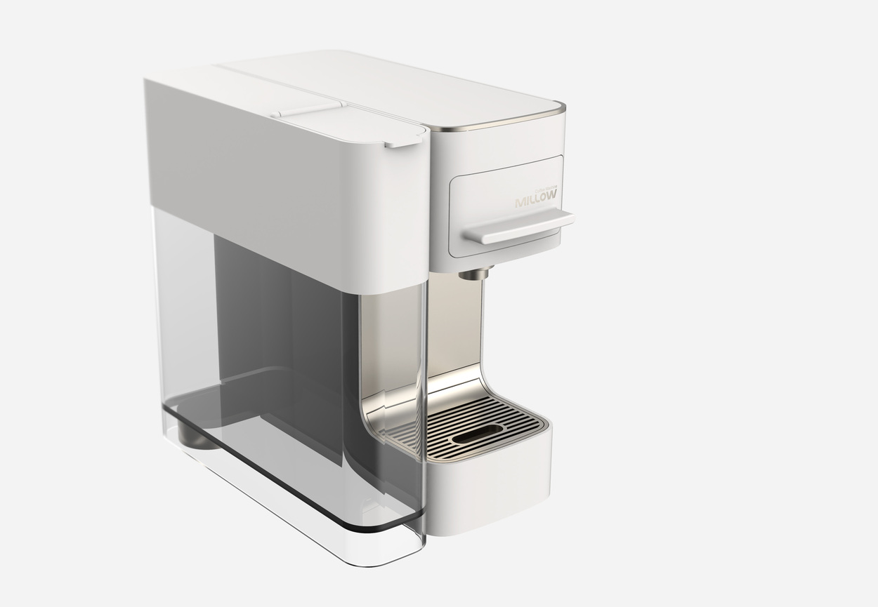 This project proposes an emotional capsule coffee machine design that harmonizes with white-toned kitchen interiors. The water tank housing was expanded to support high-volume brewing, while the front-facing thickness was minimized to emphasize a slimmer and more refined design profile.