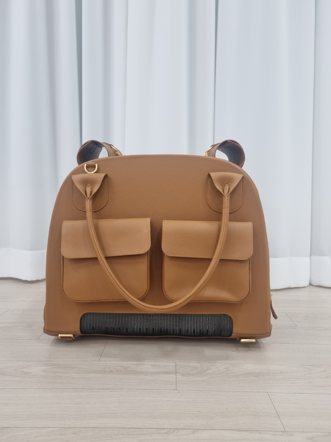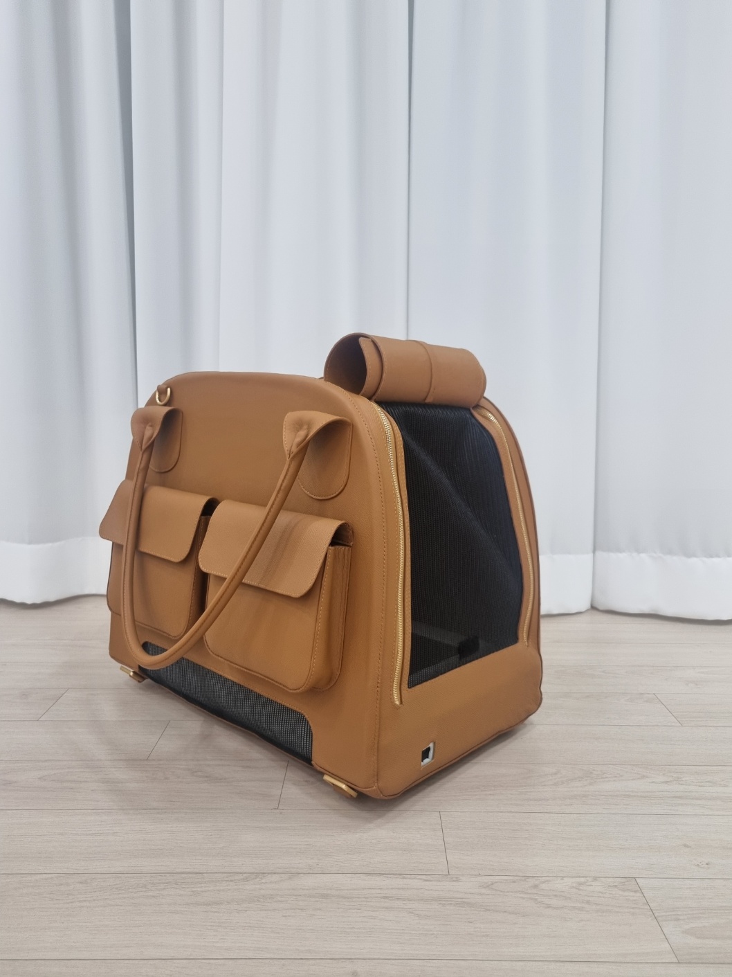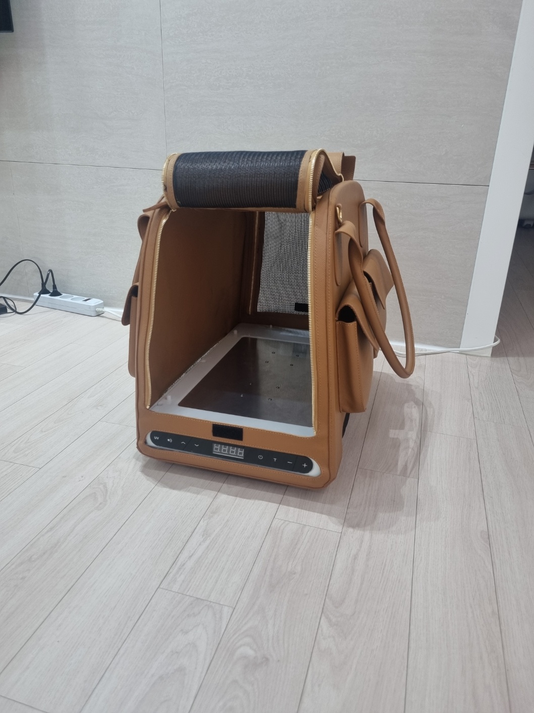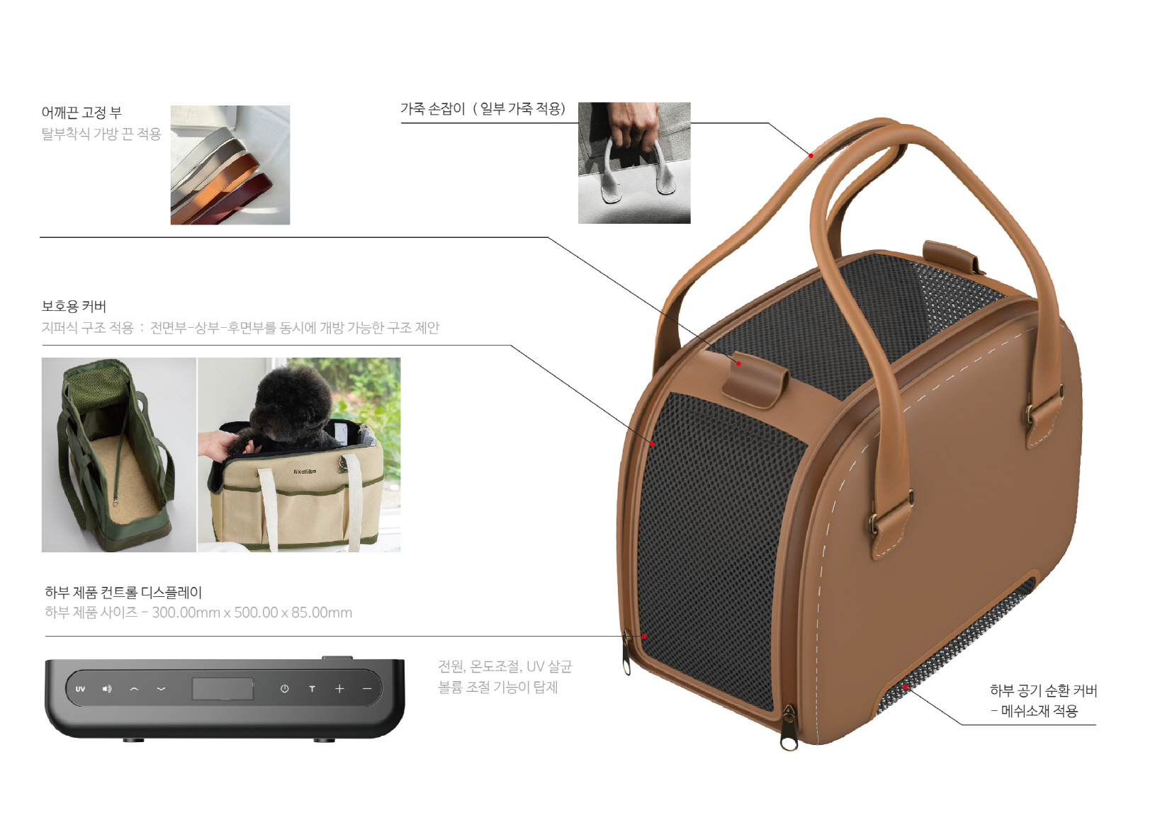 We developed a pet KD design for IoT products with cooling pads. We designed the entire cage considering the size of small dogs, and produced it with leather material according to the customer's request. It is composed of a luxurious look with stitched finishing lines and brown leather color, and a pocket on the side is organized as a design point element to store pet supplies and snacks.